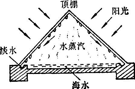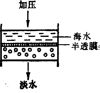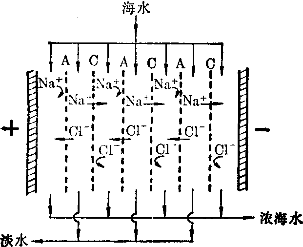 太阳能蒸馏流程示意图 蒸气压缩蒸馏 海水先经预热,至蒸发器中受热汽化,产生的二次蒸气经压缩后,又返回蒸发器夹套,冷凝成淡化水,冷凝时释出的热量可作为海水加热用。蒸气压缩蒸馏装置体积小,热功率高,可利用动力系统的余热、废热或借助电能进行淡化。国产船用电力压气式蒸馏装置即属此型,日产淡水5吨。 太阳能蒸馏 利用太阳辐射能加热海水,产生的蒸气在玻璃 (或塑料)顶棚上冷凝,水珠在重力作用下沿着倾斜的顶棚内壁流入淡水槽,集中得淡水,见示意图。太阳能蒸馏装置设备简单,不需人工能源,适用于气温高、日照时间长的缺水地区。世界各国太阳能淡化装置每平方米产水量约在1.0~4.8L之间。还有一种球状小型太阳能淡化器,由塑料薄膜制成,可用于海上救生。 蒸馏法不受海水浓度限制,制得的淡水纯度高。海水经过处理,含盐量约5~10ppm,适于作为锅炉用水。淡化水如作为长期饮用,需进行矿化处理,因水中缺乏人体需要的无机盐而且水味嫌淡。我国有关单位经研究建议以硬度(用CaO计)8°±4°为矿化标准。矿化方法可借助自动装置在水中添加石膏、硫酸氢钠、氯化钙、硫酸镁等盐类; 或使淡水通过装有钙、镁等盐片和白云石碎屑的滤器; 也可在淡水中混入少量海水。蒸馏法的缺点是设备费用较高,锅垢危害严重。为防止引起锅垢和减少设备的腐蚀,海水在蒸馏前要经过脱气、软化预处理。反渗透法 反渗透是渗透的逆过程,见示意图。将海水与淡水用半透膜(反渗透膜)隔开,于海水一侧施加大于海水渗透压(约25个大气压)的外压时,可迫使海水中的纯水反渗透至淡水中,盐分被阻留,由此将水盐分离而得淡水。 反渗透淡化装置有板框式、管式、螺旋卷式和中空纤维式四种类型。实现反渗透的核心部件是反渗透膜。膜的性能要求具有高选择透过性,并能抗压、耐温、抗水解、耐生物分解和耐辐射。目前应用的膜有醋酸纤维素(CA)膜和芳香族聚酰胺膜两大类;厚度通常为100~200μm, 也有薄至几百至几千Å的超薄型膜。 使用时是以多孔膜作为支撑物,上面涂刮超薄型膜,制成超薄复合膜。这类膜的选择透过性、抗压性和透水率都较高。 反渗透淡化器设备简单,加压范围在56~105kg/cm2之间,能量消耗少,淡化效果好。国产登攀-1型反渗透器对我国西北地区含盐3~10g/L的苦咸水有90%左右的脱盐率。美军将聚酰胺(PA-300)螺旋型干式反渗透元件安装在拖车上,用于从苦咸水或海水制取饮用水,运输方便。这种装置还能有效地除去水中化学毒剂和放射性污染物。 反渗透法所制淡水的纯度受膜性能的影响,含盐量一般约500~300ppm。为了提高淡化效果,延长膜的使用年限,海水在进行反渗透处理之前,需经消毒、净化预处理,除去水中的悬浮颗粒。淡化后的水,饮用时仍需消毒。 电渗析法 原理如图所示,阴离子交换膜(A)和阳离子交换膜(C)相间排列,隔成多个区间,海水充满于间隔中,在外加直流电场作用下,阴、阳离子分别透过阴膜和阳膜,从而使一区间海水淡化而其相邻区间的海水被浓缩,淡、浓水得以分离。决定电渗析法淡化水水质好坏的关键是离子交换膜。离子交换膜要求具有优良的选择透过性(即阴膜只许阴离子透过,阳膜只许阳离子透过)、优良的电化学性能、足够的机械强度和化学稳定性。 我国电渗析技术的研究自七十年代以来发展很快,除用于海水、苦咸水的淡化外,在解决工业、医疗卫生、电子、电力用水、废液处理等方面都显示了优越性。我国现有各种类型的电渗析器千台以上,脱盐率60~90%,其中日产200吨的海水淡化电渗析装置已在岛屿安装试用。