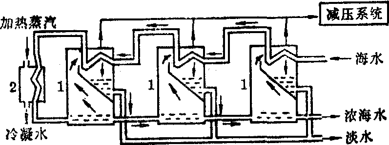 多级闪急蒸馏流程示意图 1. 闪蒸室 2. 加热器