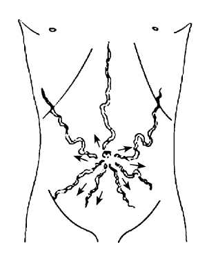 又称“水母头征”。这是门静脉高压的特征之一。系指自脐部向四周放射的一簇迂曲扩张的静脉,见于门静脉阻塞时。