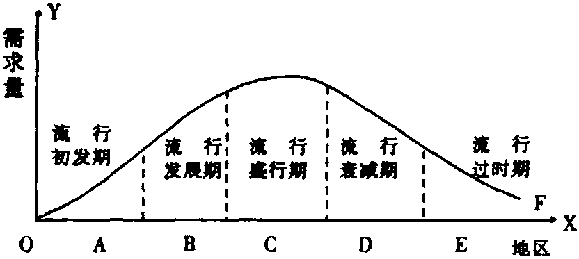 图中横轴表示不同地域,纵轴表示需求量,曲线OF表示消费品从流行初发期、发展期、盛行期到过时期需求量变动的情况。横轴所标A、B、C、D、E,表示不同的地区,对应消费品流行的不同时期,可以明显看出同一时间内,消费品流行的地域差异。