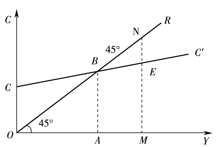 消费曲线xiāo fèi qū xiànкрив я потреблéния消费曲线Consumption Curve用来表示消费与收入之间函数关系的曲线,是消费函数的图形表示。用横轴表示收入水平,纵轴表示消费水平。OR为边际消费倾向为1时的消费曲线,其与横轴的夹角为45度,OR线上的任何一点都表示消费等于储蓄。CC′为另外一条消费曲线,与OR相交于B点,表示收支均衡点。在该点上,OA=AB,表示收入全部被消费。在B点左面,C>Y,表示消费大于收入,有负储蓄;在B点右面,C.jpg)