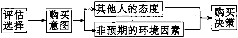 做出购买决定和实现购买,是购买决策过程的中心环节。经过评价选择之后,消费者对某些产品便形成了一定的偏爱,产生了购买意图,购买选中的商品,顺利完成交易过程。然而,在购买意愿与购买决策之间有两个因素介入其间,这些因素如下图所示: