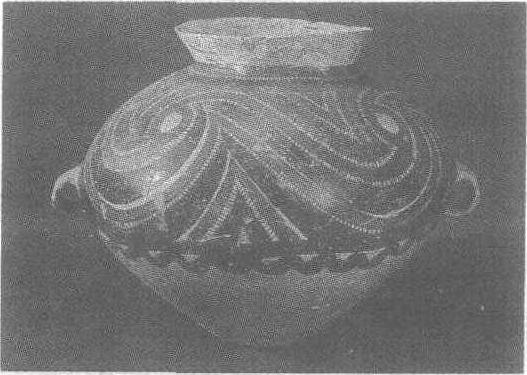 | 释义 | 涡纹双耳彩陶壶 涡纹双耳彩陶壶新石器时代。高33.5厘米,口径20.8厘米,底径15.9厘米。甘肃省广河县出土。北京中国历史博物馆藏。此壶为泥质红陶,手制而成。撇口、鼓腹、双耳。腹部用黑、红彩绘边缘呈锯齿状的旋转涡纹、三角纹多重,及一圈波浪纹。纹饰细腻娴熟,富韵律感。