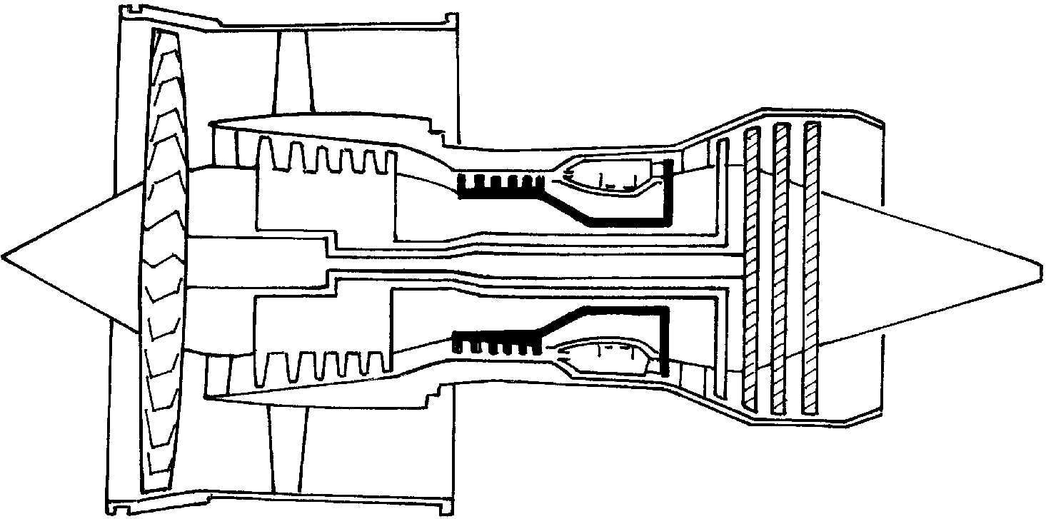 | 释义 | 涡轮风扇发动机 涡轮风扇发动机turbofan engine又称“涡扇发动机”。由喷管喷射出的燃气与风扇排出的空气共同产生反作用推力的燃气涡轮发动机。由压气机、燃烧室、高压涡轮(驱动压气机)、低压涡轮(驱动风扇)和排气系统组成。其中前3部分称为“核心机”,由核心机流出的燃气中的可用能量,一部分用于带动低压涡轮以驱动风扇,一部分在喷管中用以加速喷出的燃气。涵道比与耗油率关系密切。20世纪50年代末出现的第一代涡轮风扇发动机,涵道比、压气机增压比和涡轮前燃气温度都比较低,耗油率0.06~0.07kg/(N·h),推力55~80kN。20世纪70年代初出现的第二代涡轮风扇发动机涵道比(5~8)、增压比(25~30)和涡轮前燃气温度(1600~1750K)都比20世纪50年代的为高,耗油率降低到0.03~0.04kg/(N·h),推力高达300~350kN,是高亚音速客机理想的动力装置。中国民航使用的波音747-400型飞机上安装的涡轮风扇发动机即属此类。