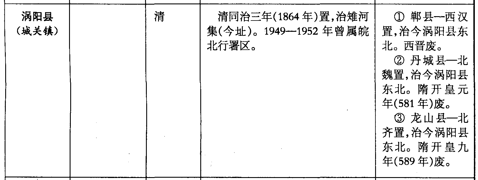 涡阳县(城关镇)清清同治三年(1864年)置,治雉河集(今址)。1949—1952年曾属皖北行署区。❶ 郸县—西汉置,治今涡阳县东北。西晋废。❷ 丹城县—北魏置,治今涡阳县东北。隋开皇元年(581年)废。❸ 龙山县—北齐置,治今涡阳县东北。隋开皇九年(589年)废。