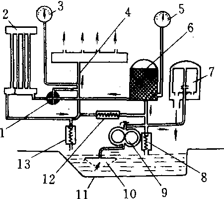 压力式润滑系油路 1. 开关 2.机油散热器 3.机油压力表 4. 主油道 5.机油温度表 6. 机油粗滤器 7. 机油细滤器 8. 限压阀 9.机油泵 10.集滤器 11. 油底壳 12.安全阀 13. 回油阀 |