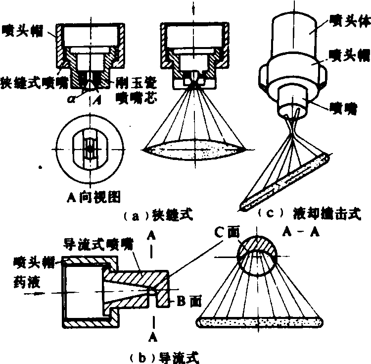 图1 圆锥雾喷头 1.喷头片; 2.垫圈; 3.滤网; 4.喷头体;5.旋水片;6.喷头帽;7.旋水芯 扇形雾喷头 与圆锥雾喷头相比较,雾滴较粗,在相似条件下的雾流分布范围较窄,但定量定向控制性能较好,能较精确地洒施药液,其结构形式有狭缝式、导流式、液流撞击式等(图2)。其中以狭缝式应用最广。