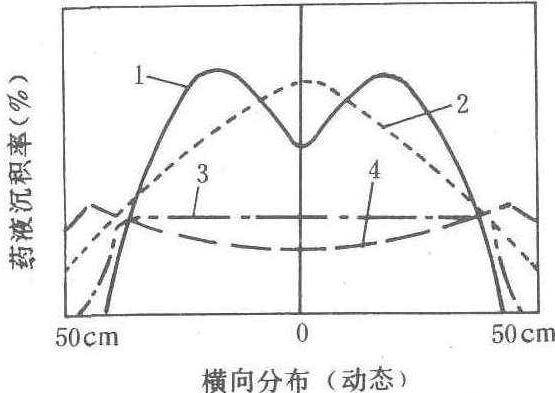 ❸配用的液泵有容积泵和非容积泵之分。容积泵强制供液,设有安全阀,用以调节喷雾压力,并对泵起安全保护作用;非容积泵不强制供液,不必有安全阀,也不用减少泵流量的方法调整喷施压力。 ❹喷头有多种形式,常使用的有圆锥雾喷头、扇形雾喷头和导流式喷头。各种喷头喷雾药液沉积分布形式见图2。 ![]()