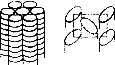 液晶 液晶yejing介于各向同性液体与晶体之间的一种新的物质状态。1888年奥地利植物学家F.赖尼策尔对胆甾醇苯酸酯加热时发现,在145℃时,该固体熔解为白色混浊液体,呈浓雾状。当这种液体的温度上升到179℃时,又变成清彻透明的液体。翌年,德国晶体学家O.勒曼又发现,该液体在混浊相时的特点是既有液体的机械性能,例如可流动和低粘性,又有晶体的各向异性光学性质,因此,他把该物质定名为液晶。液晶相常被称为中间相,凡具有这种中间相的物质都被称为液晶。液晶并非稀有物质,目前已知道的就有数千种,它们都是长形分子或盘形分子的有机化合物,长形分子典型的长度范围为15×10-10~40×10-10米,宽为10-10米的数倍。高分子聚合物加热熔化而成的液晶称为热致液晶;某些高分子聚合物溶解于适当溶剂(如水、硫酸、甲苯等)里,随着浓度的改变而出现不同的液晶态,称为溶致液晶。溶致液晶与温度也有一定程度的关系。热致液晶的长形分子依其排列状态的不同又可分为三类: ❶向列相,又称丝状相。其分子大致平行排列(图1示),但空间分布是混乱的,分子质心可以在三个方向平移,即彼此间上下左右前后的位置可以变动。这类液晶的例子是对氧化偶氮甲氧苯,它存在的温度范围为116~136℃。 ❷胆甾相,又称螺旋状相。其分子分层排列,每层分子的排列方向相同,但相继各层中分子的取向相差一个小角度,形成各层分子排列方向呈螺旋式改变,螺距h的典型值约3×10-7米(图2)。因为这种物质有螺旋形结构,所以它显示出旋光性,即当光线沿螺旋方向传播时,光的偏振面要旋转,在某些情况下,它对透射光的旋光本领可大至60000度/毫米。而通常的有机化合物的旋光性只有300度/毫米。这类液晶通常是胆甾醇酯,例如胆甾醇肉桂酸盐,它存在的温度范围为156~197℃。 ❸近晶相,又称层状相。其分子分层排列,层内分子互相平行,其方向与层面垂直,或有些倾斜(图3)。各层的分子只能在本层内运动,分子质心可以无序、能自由平移,或有序呈二维点阵。层与层之间有微弱的相互作用,能容易地滑动,或者可相对转动,按照分子空间分布的类型和排列方向相对于层平面的倾斜量又可把近晶相细分为一些子相。例如在近晶A相中,分子与层面垂直,在C相中分子相对层面倾斜,在B相中,层内分子质心排列成面心六角形,在D相中,层内分子又分组构成体心立方体结构。近晶相液晶的例子是乙基对氧化偶氮苯酯,它存在的温度范围为114~120℃。在所有的中间相中,近晶相与晶体的结构最接近,它们的差别是近晶相具有层状结构。1977年,印度S.钱德拉塞卡等合成了盘形分子的液晶。盘形分子液晶具有向列相,胆甾相和柱状相三种结构。向列相和胆甾相与上述长形分子的情况相似,只用把长棒轴换为盘形分子的法向轴即可。柱状相中的分子堆积成柱,在同一柱中分子间隔可以是规则有序的,也可以是不规则无序的。各分子柱可以排列成六角形或长方形的二维点阵(图4)。长形和盘形分子构成的液晶的各向异性与分子本身的不对称形状有关。 液晶在被发现后的一个相当长时期内没有得到实际的应用,直到10多年前发现液晶分子的排列可以受到电的控制而改变其光学性质,因而可当作显示材料,这才引起人们的兴趣。现在液晶已被广泛应用。液晶的各种性质已用来研制多种物理器件,尤其是电光器件,目前应用最广泛的是向列相和胆甾相液晶的电光效应。例如可用来作电子手表、微型计算器等的数字显示器件。液晶电光器件的功率消耗低,每平方厘米显示面积只需要消耗1毫瓦的电能,而且在常规照明条件下就可显示出清晰的像。又如用铁电性近晶相液晶可制成双稳态的微秒电光开关。现在小型液晶显示的平板电视也已制成。胆甾相的螺距对温度、压力、杂质等都很敏感,而改变螺距就能改变液晶的颜色,因此可用胆甾相来诊断皮下肿瘤,探知金属材料和零件的缺陷,以至在压力量度,红外、紫外、x射线显示,气体动理学和分析化学等方面都可加以利用。液晶与生物的关系也非常密切,在人体的脑、肌肉、肾上腺皮质、卵巢、神经髓梢、眼睛光感受器的膜层等处都发现有溶致液晶结构,因此生命现象与生物液晶直接相关,一些重要的生命现象(例如:衰老、癌变等)就可能与生物细胞膜的液晶态相变有关。溶致液晶在石油化工和医学方面也都有重要应用。