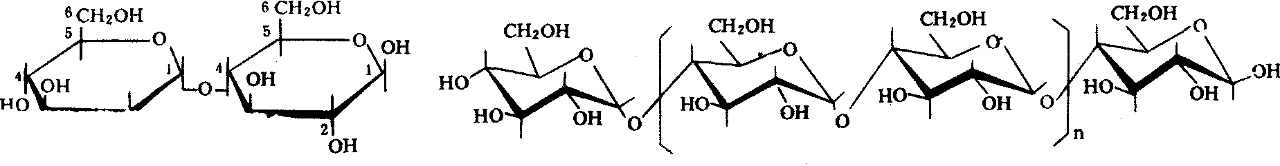 | 释义 | 淀粉diànfěn有机化合物,白色,是主要的碳水化合物食物,重要的营养物质。多存在于粮食作物的种子或块根(如稻谷、麦子、甘薯)中。 淀粉diàn fěn一种有机化合物。1889年傅云龙《游历日本图经》卷十三:“类: 糖果面包、茶珈琲、烟草、谷蔬果种、挽粉淀粉、味噌尝物渍物。”1904年萧瑞麟《日本留学参观记》卷下:“黑板写淀粉为茎根之养分。”◇粉质、小粉、糊剂。 淀粉starch由D-吡喃葡萄糖基通过α1→4或α1→4、α1→6连接而成的多糖。无分支的称为直链淀粉(Amylose),由几百个D-吡喃葡萄糖基以α1→4糖苷键连接而成长链螺旋状结构,溶于热水,遇碘显蓝色,无还原性。有分支的称为支链淀粉(Amylopectin),由数千个D-吡喃葡萄糖基以α1→4糖苷键,分支处以α1→6糖苷键连接而成多分支树枝状结构,不溶于热水,遇碘显紫红色,无还原性。是植物中最重要的贮存多糖。在种子、块茎和块根中作长期贮存,萌发和抽条时才动用;在光合组织叶绿体内作短期贮存,暗时便转变成蔗糖输出。淀粉粒中两种淀粉的比例随植物种类而异,一般含15%~25%的直链淀粉,75%~85%的支链淀粉,但糯稻淀粉粒几乎全是支链淀粉,豆类淀粉粒则几乎全是直链淀粉。是人类的粮食和动物饲料的主要成分,也是酿造、食品和医药工业的重要原料。 淀粉 淀粉dianfen一种多糖。由α-D-葡萄糖组成的均聚糖。也可以说是麦芽糖的高聚物。白色颗粒状固体。相对分子质量较小的淀粉可溶于热水形成胶体,相对分子质量较大的不溶于热水,但在水中溶胀。淀粉大量存在于植物的种子或块茎中,是植物贮存营养物质的主要形式。淀粉有直链淀粉(见图)与支链淀粉两类,常混合存在,绿豆淀粉以直链淀粉为主,糯米淀粉主要是支链淀粉,含支链淀粉较多的食品吃起来比较粘。