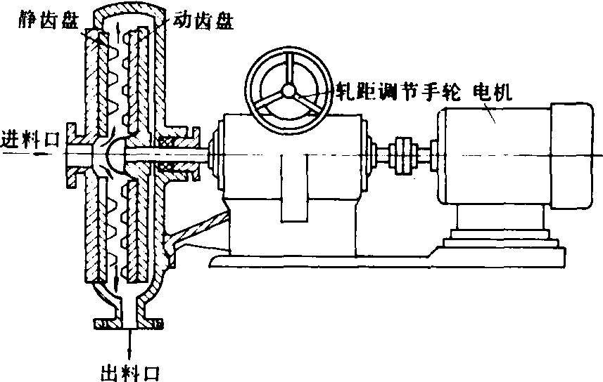 图1 玉米脱胚磨 玉米脱胚磨的生产能力为1.5~8吨/小时,磨盘直径为400~900毫米,转速960~1450转/分,配用动力11~55千瓦。此磨因具有梯形状凸齿,便于改变齿间隙,故胚芽破碎少、收率高。 锥形钢磨 适用于以玉米、薯类和豆类为原料的小型淀粉厂。主要工作部件为安装在同一轴上的两对带斜纹齿的磨头、磨套。当物料从进料斗进入机内,由喂料螺旋将物料强迫送入小磨头和小磨套之间进行第一道磨,紧接着进入大磨头和大磨套之间进行第二道磨。根据物料性质及产量,可调整大磨头与大磨套之间的压力,使被磨物料达到要求后从出料口排出机外。 金刚砂轮磨 利用金刚砂盘之间的挤压、剪切和碾磨作用使物料磨碎的设备。有立式和卧式两种。卧式金刚砂轮磨结构与玉米脱胚磨相似,只是把齿盘换成磨盘。磨盘直径为400~600毫米,转速850~1 300转/分,配备动力7.5~30千瓦。工作时,物料从进料口进入静磨盘和动磨盘之间进行精磨,借助轧距调节手轮来调整两磨盘之间隙,使被磨物料达到所需要求后,从出料口排入分离洗涤工段。 金刚砂轮磨工作时因有砂粒脱落,仅适用于用流槽分离淀粉与蛋白的中、小型淀粉厂,对使用曲筛、碟片离心机、旋流器机组的淀粉厂不宜使用此机。 冲击磨 适用于现代化程度较高的大、中型淀粉厂。它是一种主要靠撞击力来粉碎物料的高速粉碎机,有立式和卧式两种。图2所示为立式冲击磨。物料从进料斗均匀地喂入高速旋转的旋转盘上,在离心力作用下穿越柱销,受连续的撞击作用,最后撞在齿圈上,粉碎物料从底部出料口排出。 冲击磨的主要参数是:转盘直径为φ450~1000毫米,线速最高可达100~110米/秒,配备动力22~110千瓦,处理量为1~5吨玉米/小时。此磨皮渣大,有利于筛分;渣中联结淀粉少,淀粉游离率高,质量好。但动力消耗大。