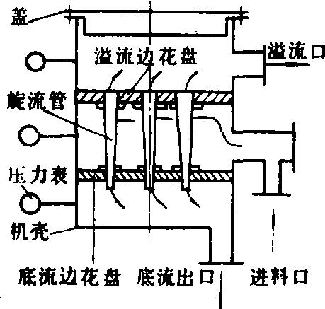 图4 碟片喷嘴型分离机 用于淀粉加工的碟片喷嘴型分离机,根据所起作用不同而结构也有所区别。图4所示的分离机在玉米淀粉生产中用作初级分离蛋白;在小麦淀粉生产中用于A淀粉(淀粉颗粒较大,蛋白质含量较少)精制;在马铃薯和食用木薯淀粉及变性淀粉生产中用于淀粉的洗涤。若去除清洗水泵后就成了浓缩机,在玉米淀粉生产中用于淀粉乳的浓缩;在小麦淀粉生产中作为预浓缩机;在马铃薯淀粉生产中用于汁水分离。若再去除向心泵并增加浓缩物的外部循环装置,则可用于玉米麸质浓缩及小麦B淀粉(淀粉颗粒较小,蛋白质含量较多)的浓缩。 旋液分离器 分离淀粉和蛋白质的一种新型淀粉精制设备,简称旋流器。自20世纪50年代以来被世界各国应用于淀粉行业,由6~15台串联组合成淀粉逆流洗涤系统,每台由数十至数百个直径为8~15毫米的尼龙旋流管并联组成,机壳材质为铸铜或不锈钢,各台之间用泵、不锈钢管、阀等连接而成一个系统。 旋流器工作原理如图5所示。含蛋白质的淀粉乳用泵以600~800千帕的压力从进料口泵入机内,切向进入各旋流管内,在离心力作用下,轻质(蛋白)从溢流口排出,重质(精淀粉乳)从底流口排出。