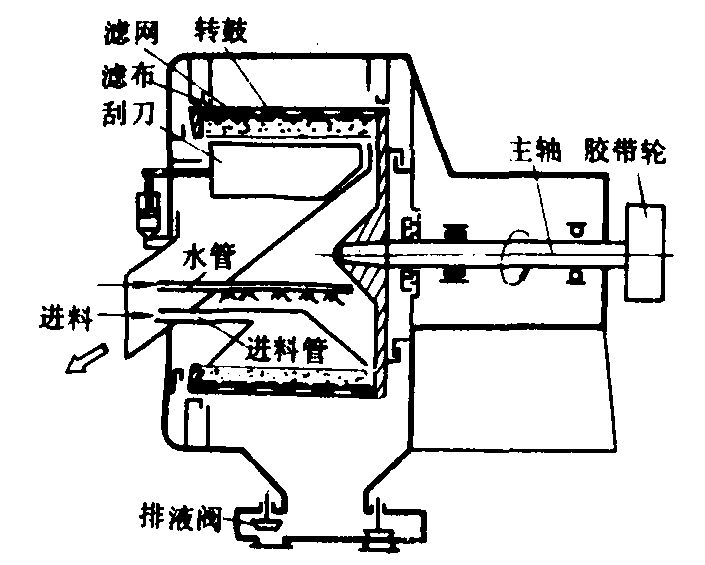 图6 卧式螺旋沉降离心机 1.差速器;2.外壳;3.转鼓;4.螺旋输送器;5.溢流环;6.进料管 淀粉脱水设备 用离心力或真空过滤的办法脱去精制淀粉乳中部分游离水的机器。淀粉行业中通常应用的有三足式离心机、刮刀卸料离心机和真空吸滤机三种。图7是在中国应用最广的卧式刮刀卸料离心机。工作时,从水管进水清洗滤布与滤网,淀粉乳从进料管进入高速运转的转鼓内,在离心力的作用下,淀粉乳中的大部分游离水经滤布、滤网及转鼓壁的小孔甩出,流向排液阀,湿淀粉则被阻留在转鼓内的滤布上,达到要求水分后,由自动刮刀将滤布上的湿淀粉刮下,排出机外。每个操作周期中的洗网、进料、脱水、卸料等操作,是由电器控制液压系统顺序完成的。