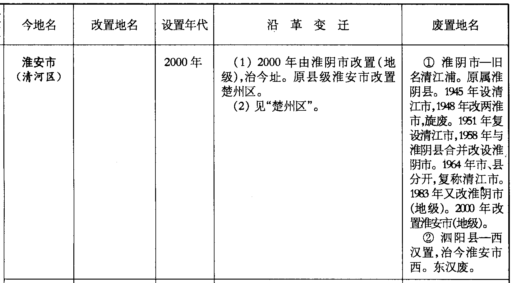 淮安市(清河区)2000年(1) 2000年由淮阴市改置(地级),治今址。原县级淮安市改置楚州区。(2)见“楚州区”。❶ 淮阴市—旧名清江浦。原属淮阴县。1945年设清江市,1948年改两淮市,旋废。1951年复设清江市,1958年与淮阴县合并改设淮阴市。1964年市、县分开,复称清江市。1983年又改淮阴市(地级)。2000年改置淮安市(地级)。❷ 泗阳县—西汉置,治今淮安市西。东汉废。