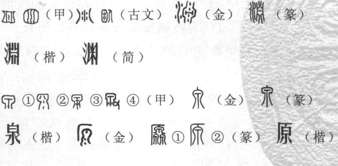 淵、泉、原三个字,有四同: 一是同是近取诸身的造字,它同取象于人体的一个部位 。 二是同以 “安” 为韵母,同声同源。 三是都与水有关,揭示人及人类生命的“来龙”。 四是语境相同,说的都是男女的生殖部位。 甲骨文❶的“淵” ( ), 原本是个象形字, 而在流变过程中已经讹变得面目全非。它的原样应该是女性阴部的图像。左右两边为两股股根部位,中间为八卦易经体阴性符号“‖”,在这里为女阴。中心部位的一竖为八卦易经体阳性符号“ ”, 在这里表示通。 甲骨文❷的“淵”( ), 为会意字, 一个近似圆形轮廓中藏有一个“水”字,它是在甲骨文❶基础之上形成的,在这里可会意为女阴。“淵”殷墟卜辞用作水域,“戊戌卜,行贞。王其田于淵无灾”。是说商王田猎时涉足于这个水域,没有发生灾祸。古文❶的“淵”( ), 是个带有象形韵味的会意字。“八”分两边,为两腿根部内侧部位,中夹一“水”字,其含意与甲骨文❶❷无异。 古文 ❷的“淵”( ),是个会意字。左边的“ ”与甲骨文❷无异, 右边站立一人, 标示着“ ”是人身的一部分。 金文的 “淵”( ),对古文❶的 “八” 与 “水” 形状有所讹变;增加偏旁“水”; 八内之“一”是水的静止状态的标示。小篆、 楷书的 “淵”( ), 从水、 从行 (为衍)、从一,从‖,衍亦声,为形声会意字。水满为衍,标示水多;“‖”(八) 是阴性符号,在这里是两股股根的演变; “一”为休止符,在这里是标意水的静止状态。河流中相对静止状态的水是深水。简化后的“渊” 无字理可言。“淵”原本取象于女阴,其本意是潭水深深。语词在长期使用中不断丰富,因此将深潭之水称“渊水”,将深奥、深邃称 “渊玄”,将深渊中水之曲折旋涡称 “渊回”,将深泉之水称 “渊泉”,将事物的本源称 “渊源”,将人或动物聚集的地方称 “渊薮” 等等。 《说文》: “渊,回水也。从水,象形,左右岸也,中像水皃。”许慎析形有误,“回水也” 显然不是 “渊” 的本意,“左右岸也,中像水皃”是典型的望文生义。