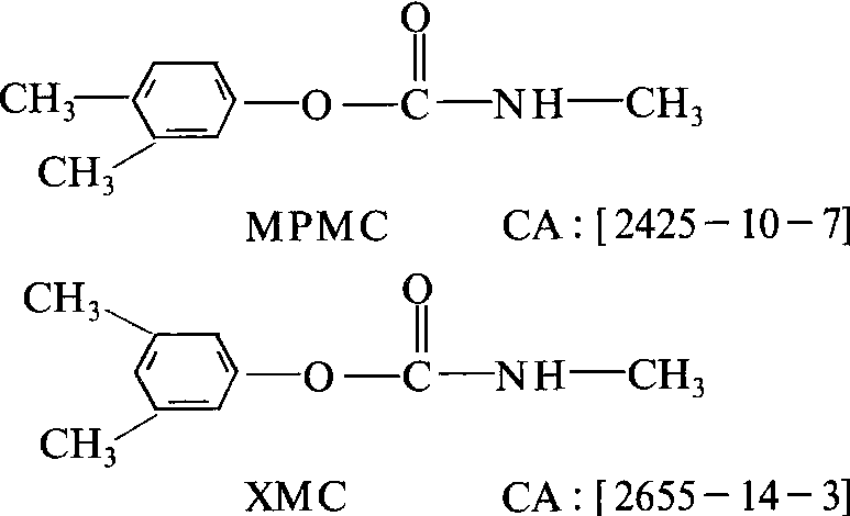混灭威含多种异构体的氨基甲酸酯杀虫剂,主要活性成分是灭杀威(MPMC)和灭除威(XMC)的混合物。化学结构式:  中国江苏首先开发。 工业品为淡黄色至红棕色油状液体,微臭,密度约1.0885,温度低于10℃时,有结晶析出,不溶于水,微溶于汽油、石油醚,易溶于甲醇、乙醇、丙酮、苯和甲苯等有机溶剂,遇碱易分解。对高等动物毒性中等,雄性大鼠急性口服LD50为441~1050毫克/千克,雌性为295~626毫克/千克。小鼠急性经口LD50为214毫克/千克,经皮LD50>400毫克/千克。对鱼类毒性小,红鲤鱼48小时TLm为30.2毫克/千克。具强触杀作用,速效性好,残效期短,只有2~3天。药效不受温度变化影响。主要用于防治稻叶蝉和稻飞虱,在若虫高峰使用,击倒速度快、药效好。对稻蓟马、甘蔗蓟马也有良好防治效果。也可用于防治棉叶蝉、棉造桥虫、棉铃虫、棉蚜、大豆食心虫、茶长白蚧若虫。混灭威MPMC+XMC3,5-二甲苯基甲氨基甲酸酯和3,4-二甲苯基甲氨基甲酸酯的混合物。化学结构式如下。原油棕液体,不溶于水易溶于甲醇、乙醇、丙酮等有机溶剂,急性口服LD50小鼠为214 mg/kg,速效性强,残效期短,对水稻叶蝉、稻飞虱效果比较好。防治稻叶蝉、稻飞虱及稻蓟马。烟草、高粱、玉米、大豆等作物上容易产生药害。