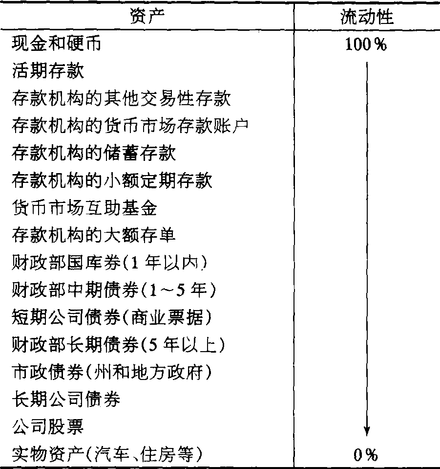 美国目前资产清偿力谱系表 | 资产 | 流动性 | | 现金和硬币 | 100% | 活期存款 存款机构的其他交易性存款 存款机构的货币市场存款账户 存款机构的储蓄存款 存款机构的小额定期存款 货币市场互助基金 存款机构的大额存单 财政部国库券(1年以内) 财政部中期债券(1~5年) 短期公司债券(商业票据) 财政部长期债券(5年以上) 市政债券(州和地方政府) 长期公司债券 公司股票 | ↓ | | 实物资产(汽车、住房等) | 0% |