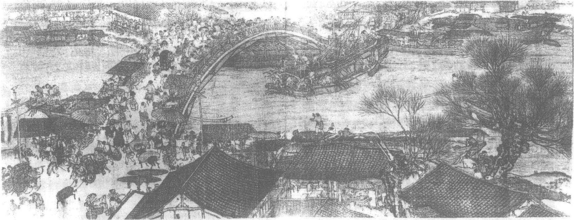 清明上河图(局部) ☚ 溪山行旅图 千里江山图 ☛ 清明上河图 《清明上河图》《清明上河图》 是北宋张择端作,绢本,淡设色,长528.7厘米,高24.8厘米。描写北宋首都汴梁 (今河南开封),汴河西岸 “物阜民丰” 的繁荣景象。横长的构图,展现了郊野、汴河及街市的景色。画卷右边开端处,是宁静的田野和村落,赶集的乡人和驮运的骡马在田间小路上渐次向城里集中。那些开始萌发枝芽的树木调节了画面的色彩和疏密,又表现出北国早春的气息。穿过一些苍劲的老树,来到城郊的街道,人们正在从停泊在河边的粮船上搬下沉重的粮袋。水波荡漾的汴河开始出现在画面上,它渐次成为画幅中的主体,一切活动都沿着汴河展开。我们看到的是市井繁盛,升平乐业的景象。拱桥横跨汴河两岸,河边的舶岸船只上的舟人生活悠闲自在,最为引人注目的是那艘准备驶过拱桥的木船,船桅已经放倒,船工握篙盘索。船上呼叫接应,岸边挥臂助阵。过往行人聚集桥头围观这紧张的一幕。而那些赶脚、推车、挑担的人们,自无暇一顾,因他们各自有谋生的重担在身。过桥往前,河上船只逐渐远去。穿街入城,来到画卷最热闹的地段。这里车马行人摩肩接踵,熙熙攘攘,茶楼酒肆、官府民居鳞次栉比,百货俱存,正是 “百家技艺向春售,千里农商喧日昼”。画上仕农工商、僧道卜医、男女老幼神态各异,官府宅第、驼马舟车具体而微……从十字街头再往前去,似将临近汴京中心,但画卷到此戛然而止,给观者留下了充分想象的余地。整幅画卷的结构宛如一首弱起强收的乐曲,以轻柔的乐段开始,几经跌宕起伏,层层展开,推向高潮,然后在热烈的气氛中结束。而贯穿全曲的主题,则是对太平时期汴梁生活的赞美和怀念。全图共画人物550个,包括男女老幼、士农工商,神情各异。还画了驴、马、牛、骡、骆驼等各类牲畜60余匹,车轿20多乘;船舳20余艘,楼屋农舍30余栋。这是具有纪实价值的历史风俗画卷,多侧面地反映了中国北宋时代城市生活的面貌,为研究中古历史文化提供了形象资料,同时又具有颇高的艺术价值。作者以精湛的绘画功力,写人状物,无不刻画精微。此图曾经北宋、金、元、明、清几代公私鉴赏,清嘉庆四年 (1799) 入藏清内府。1911年被溥仪携出故宫,抗战胜利后,在长春机场为人民解放军发现,现藏故宫博物院。 ☚ 五牛图 蛙声十里出山泉 ☛ 清明上河图 《清明上河图》《清明上河图》是北宋张择端作,绢本,淡设色,长528.7厘米,高24.8厘米。描写北宋首都汴梁(今河南开封),汴河西岸“物阜民丰”的繁荣景象。横长的构图,展现了郊野、汴河及街市的景色。画卷右边开端处,是宁静的田野和村落,赶集的乡人和驮运的骡马在田间小路上渐次向城里集中。那些开始萌发枝芽的树木调节了画面的色彩和疏密,又表现出北国早春的气息。穿过一些苍劲的老树,来到城郊的街道,人们正在从停泊在河边的粮船上搬下沉重的粮袋。水波荡漾的汴河开始出现在画面上,它渐次成为画幅中的主体,一切活动都沿着汴河展开。我们看到的是市井繁盛,升平乐业的景象。拱桥横跨汴河两岸,河边的舶岸船只上的舟人生活悠闲自在,最为引人注目的是那艘准备驶过拱桥的木船,船桅已经放倒,船工握篙盘索。船上呼叫接应,岸边挥臂助阵。过往行人聚集桥头围观这紧张的一幕。而那些赶脚、推车、挑担的人们,自无暇一顾,因他们各自有谋生的重担在身。过桥往前,河上船只逐渐远去。穿街入城,来到画卷最热闹的地段。这里车马行人摩肩接踵,熙熙攘攘,茶楼酒肆、官府民居鳞次栉比,百货俱存,正是“百家技艺向春售,千里农商喧日昼”。画上士农工商、僧道卜医、男女老幼神态各异,官府宅第、驼马舟车具体而微……从十字街头再往前去,似将临近汴京中心,但画卷到此戛然而止,给观者留下了充分想象的余地。整幅画卷的结构宛如一首弱起强收的乐曲,以轻柔的乐段开始,几经跌宕起伏,层层展开,推向高潮,然后在热烈的气氛中结束。而贯穿全曲的主题,则是对太平时期汴梁生活的赞美和怀念。全图共画人物550个,包括男女老幼、士农工商,神情各异。还画了驴、马、牛、骡、骆驼等各类牲畜60余匹,车轿20多乘;船舶20余艘,楼屋农舍30余栋。这是具有纪实价值的历史风俗画卷,多侧面地反映了中国北宋时代城市生活的面貌,为研究中古历史文化提供了形象资料,同时又具有颇高的艺术价值。作者以精湛的绘画功力,写人状物,无不刻画精微。此图曾经北宋、金、元、明、清几代公私鉴赏,清嘉庆四年(1799)入藏清内府。1911年被溥仪携出故宫,抗战胜利后,在长春机场为人民解放军发现,现藏故宫博物院。 ☚ 五牛图 蛙声十里出山泉 ☛ 《清明上河图》见“张择端”。 清明上河图 清明上河图卷水墨淡彩绢本。宋代张择端绘。高24.8公分,长528.7公分。描写北宋年代(960—1127)东京汴梁城人情物态。展示了当时的经济面貌、城乡交流和民情风俗。画的结构大体分为三段:首段是京郊的农村风光;中段是以拱桥为中心的汴河及其两岸的运输和贸易的忙碌情景;后段是城门内外街市的繁华景象。画卷中共画人物550个,50多头牲畜,20多艘船只,各种样式的房子30余栋,是我国古代规模最大的风俗画,也是一幅高度现实主义的上乘之作。此卷曾于1127年随着金人攻破汴梁而流入金内,后为明、清两代皇室收藏,卷中有金人张著,元人杨准、吴宽、冯保等