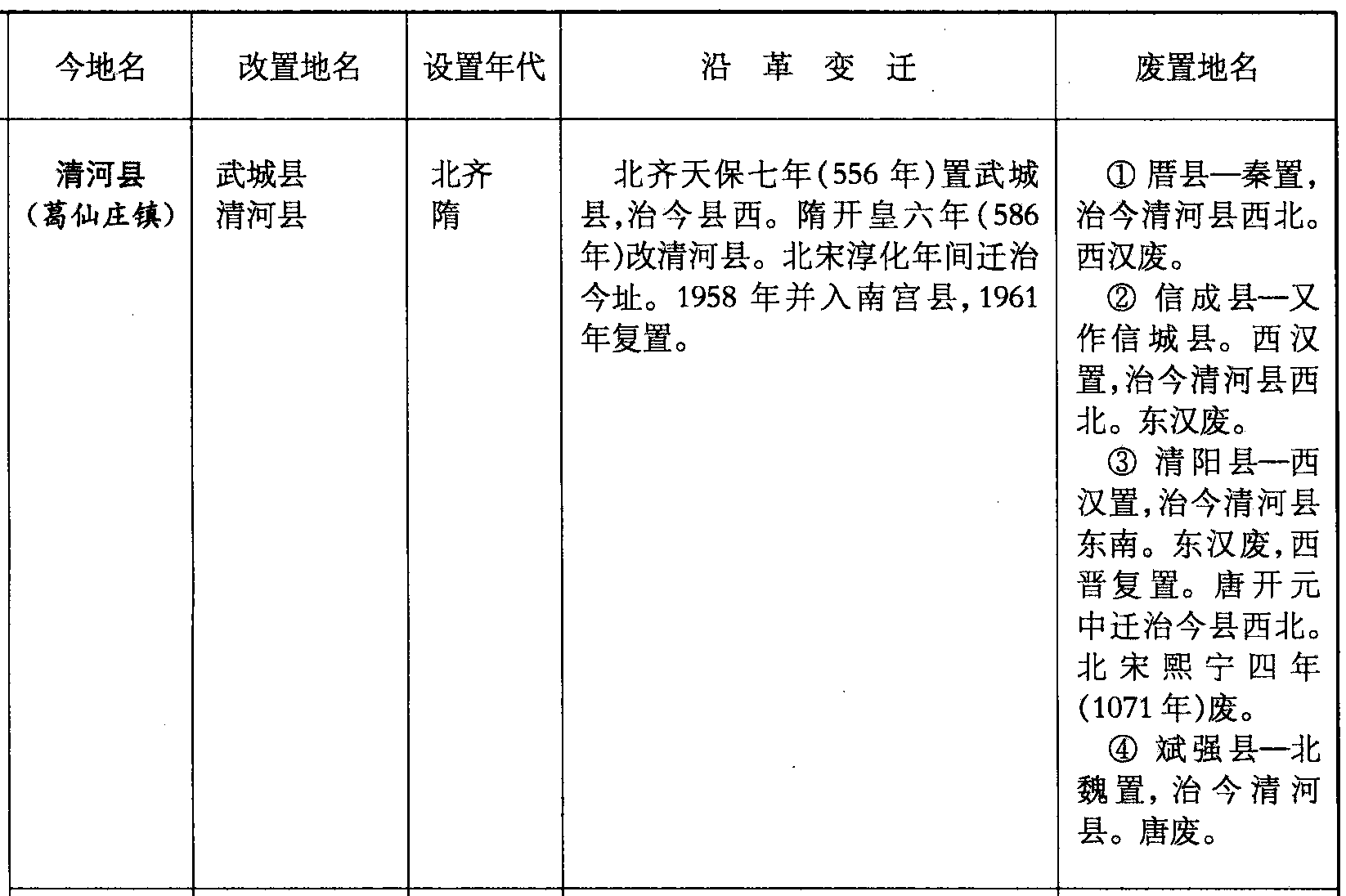 清河县(葛仙庄镇)武城县清河县北齐隋北齐天保七年(556年)置武城县,治今县西。隋开皇六年(586年)改清河县。北宋淳化年间迁治今址。1958年并入南宫县,1961年复置。❶厝县—秦置,治今清河县西北。西汉废。❷ 信成县—又作信城县。西汉置,治今清河县西北。东汉废。❸ 清阳县—西汉置,治今清河县东南。东汉废,西晋复置。唐开元中迁治今县西北。北宋熙宁四年(1071年)废。❹ 斌强县—北魏置,治今清河县。唐废。