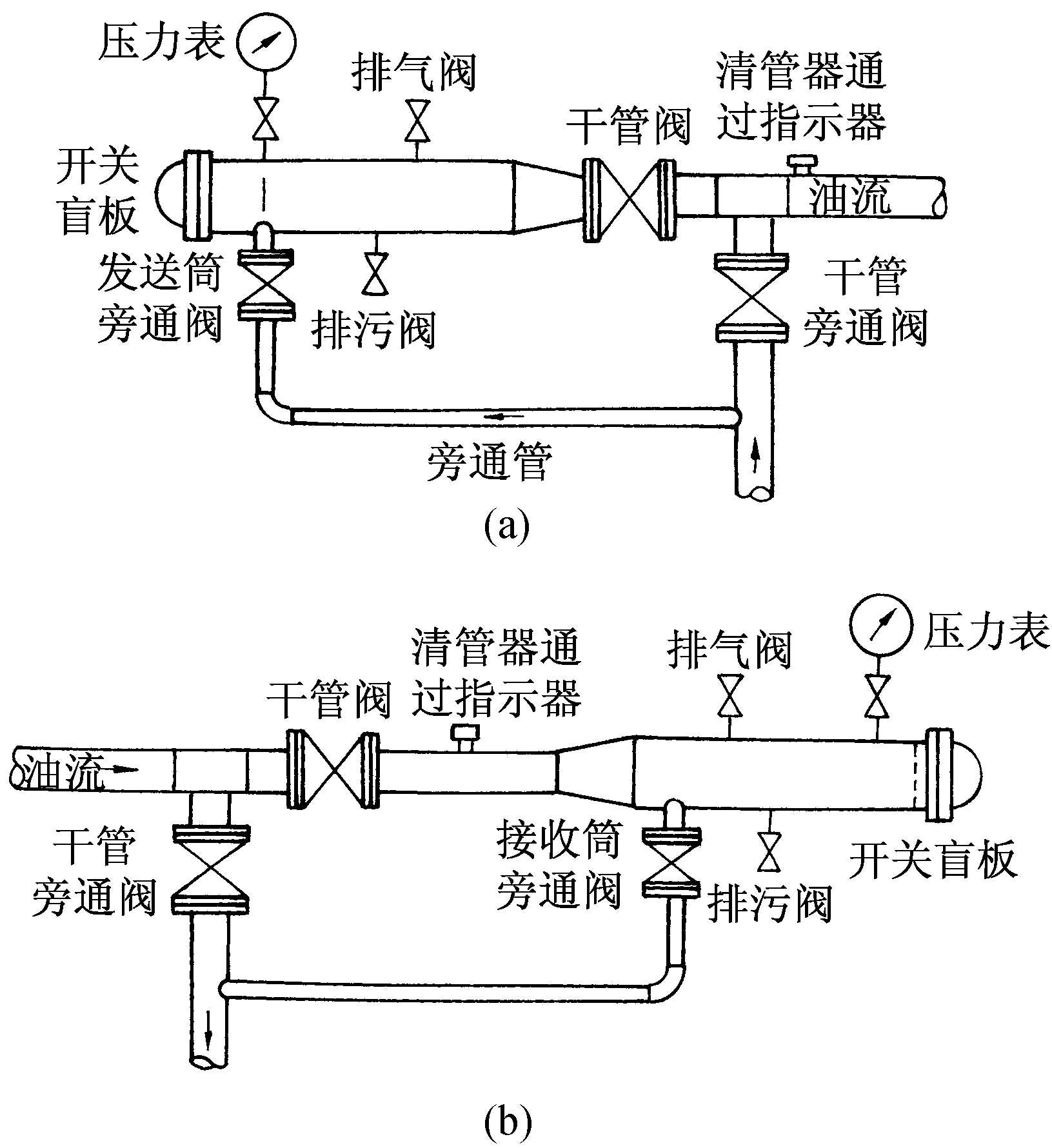 | 释义 | 清管器收发装置 清管器收发装置pig launcher and receiver trap发送和接收清管器的阀组等设施。下图为其示意图。发送时,先打开盲板把清管器放入发送筒内,逐渐开启原处于关闭状态的发送筒旁通阀和干管阀;逐渐关闭原为开启的干管旁通阀,靠油流压力将清管器从筒内推入干管;当指示器上指示清管器确已通过后,将各个阀门复原。接收时,先打开干管阀及接收筒旁通阀,再逐渐关闭干管旁通阀,待确认清管器已掉入接收筒内后,将各个阀门复原,打开排气阀及排污阀泄放筒内的压力及污油,然后打开盲板取出清管器。