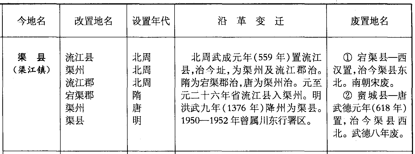 渠县(渠江镇)流江县渠州流江郡宕渠郡渠州渠县北周北周北周隋唐明北周武成元年(559年)置流江县,治今址,为渠州及流江郡治。隋为宕渠郡治,唐为渠州治。元至元二十六年省流江县入渠州。明洪武九年(1376年)降州为渠县。1950—1952年曾属川东行署区。❶ 宕渠县—西汉置,治今渠县东北。南朝宋废。❷ 城县—唐武德元年(618年)置,治今渠县西北。武德八年废。