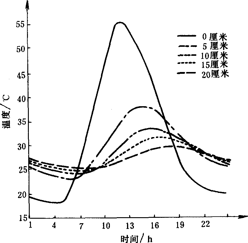 各深度地温日变化(1965年6月18日晴天 南京气象学院) 第三定律: 对周期不同的温度变化, 其变幅若要减小到同一倍数,则入地的深度与各周期的平方根成