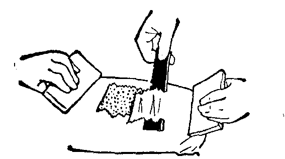 图2 全厚皮片切取法连带皮下脂肪切下,再剔除脂肪。 表层及中厚皮片的切取法,为术者与助手各持木板一块,按压于皮面并向相反的方向牵开,则两块木板间的皮肤即可形成一较实韧平坦而稳定的皮面。用刀长刃薄而锋利的切皮刀或截肢刀,就皮面作往复拉锯样行进动作就可取得皮片。刀面与取皮面所成角度的大小,决定所取皮片的厚度(图3)。此法取皮所需设备简单,如用皮面积不大,也可用安全剃刀片切取。