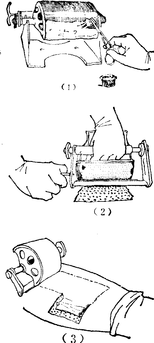 图7 电动切皮机 无论是经手工或机械切取的皮片,如暂时未及使用,应以生理盐水纱布包裹,并放入专用容器内,以防干燥,但不应浸入生理盐水内。 供皮区创面的处置 与在受皮区植皮同样重要,不可忽视。具体处置方法因所取皮片的厚度、种类,以及气候、地区等的差异而有所不同。如全厚皮片切取面积较大,其供皮区创面超出可以直接缝合的限度时,须另取较薄皮片移植闭合。非全厚皮片、点状皮片、筛状皮片等的供皮创面,通常采用单纯或含有抗菌药物的细密油制纱布1~2层覆盖,以保护源于残留腺体及其导管和毛囊等的较脆弱的新生上皮,其外方再施以较厚的松软敷料加压包扎。夏季气候炎热和过于潮湿易发霉的地区,可于术后2~3天将外层敷料除去,只保留紧贴创面的油制纱布,并促其干燥,这称为半开放法。但仍以包扎法最为常用和可靠。 受皮创面的准备 是保证移植皮片顺利成活的重要环节。如何妥善准备或选择适当时机,则视其为无菌或感染创面而定。 新鲜无菌受皮创面的准备要点,在于仔细认真的止血,因术后继发出血形成血肿往往是植皮失败的最常见原因。毛细血管渗血应以压迫法止血为主。断裂的血管应以细白丝线结扎为主,结线所留线头须尽量剪短,以减少异物反应。一般不采用电凝法止血。肾上腺素稀释液压敷也宜慎用。创面内如有不超过1×1cm面积大小的无血区,如失去腱旁组织的肌腱,无骨膜或软骨膜被覆的骨或软骨面,该部皮片仍可由“跨越现象”而成活。如大于此面积时,则须设法利用邻近软组织的有蒂移植移转遮覆后,再行植皮。如裸露面积过大,即非属皮片移植的适应证。新鲜污染创面的准备,除需清创外,其他与无菌创面要求相同。 陈旧感染创面的准备要点,在于培育较好的肉芽创面。为此,须从清除坏死组织,保持引流通畅,勤于更换敷料,控制细菌感染,适当加压包扎,和抬高肢体消除组织水肿等措施入手。至肉芽色泽红润,组织致密平坦,易出血,无水肿,分泌物不多,四周创缘无炎症现象并见有新生上皮出现时,施行皮片移植的条件即告成熟。植皮时,可将肉芽组织削除,如肉芽平薄也可保留。 皮片的移植和固定 是皮片移植术的最后操作步骤,也是保证皮片成活的另一重要环节。受皮创面经过细心充分准备后,移植的皮片又得到稳定可靠的制动,才能使皮片与创面间及时建立血运而成活。移植和固定的方法,因受皮创面的性质和解剖部位等的不同而异。一般以大张皮片移植缝线包压法应用最广,加压包扎法次之。此外,还有不甚常用的内嵌、外嵌、开放、重叠、种子、延期等植皮法。四肢关节等部位植皮,还常需外用石膏绷带制作的托板辅助制动,以使固定更为稳妥。 缝线包压法,又称打包法、包堆法、缝扎法、缝合压力敷料法等。普遍用于无菌或污染创面的大片整张植皮,感染创面通过精心准备,培育出良好的肉芽组织后,如行大张皮片移植时也可采用。其法,为将皮片与受皮创缘相缝合时,每隔数针留长线一条备用。移植全厚皮片,须注意按样型所示形状方位与受皮创面准确对合。移植非全厚皮片,注意随创面形状和创缘走向适当剪裁,以保持皮片松紧适度接近其原来的张力,和与受皮创面自然地密切贴合。如创面凸凹不平,为避免凹处皮片漂浮,应加用贯穿皮片并缝连基底创面组织下垫小团纱布结扎的绷线缝合。绷线缝合还于需要加强制动或减少包压敷料的厚度时用之。缝合毕,细心排除皮片下的积血或气泡,必要时尚可在皮片上刺穿多数小孔以利引流。然后用以生理盐水浸过的大网眼细纱布蓬松均匀地堆置于皮片上,注意妥贴填实。最后将缝合创缘时所留长线互相对应结扎(图8)。缝线包压法可以保持皮片与受皮创面间稳定而密切的接触,其外方再覆以多层纱布或棉垫加压缠扎。