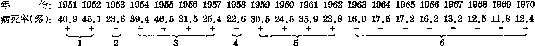 根据逐年病死率的变化(计相邻两年病死率之差的符号),得下列符号序列: