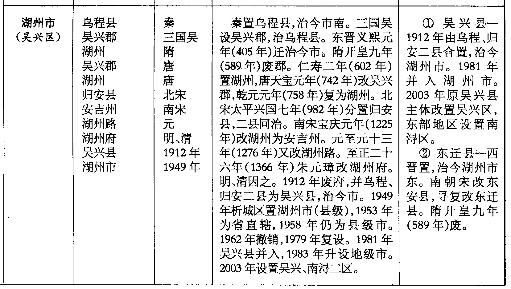 ❷ 东迁县—西晋置,治今湖州市东。南朝宋改东安县,寻复改东迁县。隋开皇九年(589年)废。