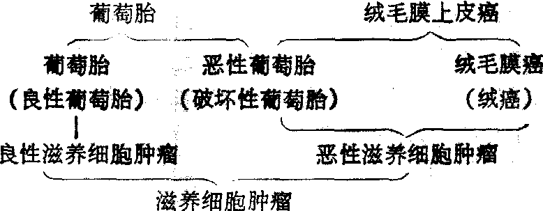 | 释义 | 滋养细胞肿瘤由绒毛膜的滋养层细胞过度增生发生的肿瘤。根据滋养层细胞增生的程度、有无绒毛、侵蚀的能力及其它生物学特性,分为葡萄胎、恶性葡萄胎及绒毛膜癌。 滋养细胞肿瘤trophoblastic cell tumor包括葡萄胎、恶性葡萄胎和绒毛膜上皮癌,是人体一种奇特的肿瘤,绝大多数继发于妊娠后。其组织来源为胚外层。此类肿瘤生长极快,即是良性葡萄胎亦具有潜在恶性。恶性葡萄胎侵蚀性强,故亦称侵蚀性葡萄胎。绒毛膜上皮癌恶性高,早期即可发现血行转移。肿瘤细胞含有男性成分,从免疫角度看,是一种同种异体移植,具有高度抗原性,但不受宿主排斥。 滋养细胞肿瘤 滋养细胞肿瘤滋养细胞肿瘤是胚胎滋养细胞发生的肿瘤。过去共分两种:良性的称葡萄胎 ,恶性的称绒毛膜上皮癌。以后由于发现介乎这两者之间的还有一种,形态上象葡萄胎,但行为上象绒毛膜上皮癌,具有一定程度的恶性,有人归类于葡萄胎,有人归类于绒毛膜上皮癌,极为混乱。为改进起见,乃将这一种滋养细胞肿瘤另列为一类,称恶性葡萄胎或破坏性葡萄胎。同时由于滋养细胞系来自胚外层组织,不是来自胚胎的外胚层,在性质上不能称为上皮细胞,故将绒毛膜上皮癌,改称为绒毛膜癌,而废除绒毛膜上皮癌这一名称。因此,目前的所谓滋养细胞肿瘤共有三种,葡萄胎(或良性葡萄胎),恶性葡萄胎(或破坏性葡萄胎)和绒毛膜癌(简称绒癌)。由于都是来自滋养细胞、总称滋养细胞肿瘤,良性的葡萄胎为良性滋养细胞肿瘤,恶性的恶性葡萄胎和绒毛膜癌为恶性滋养细胞肿瘤,各名词之间相互关系可以下图表示: