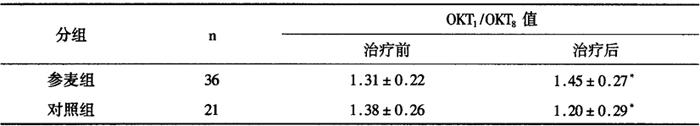 2组治疗前后比:*P<0.05 参麦液对化疗后体液免疫球蛋白影响,治疗后分析提示,无论参麦组还是对照组,IgG、IgA、IgM值均无显著变化(P>0.05)。 参麦液对骨髓功能的影响,对外周血白细胞和血小板的影响:根据WHO抗癌药物急性与亚急性毒性反应分度标准分析表明,参麦组外周血白细胞和血小板降低程度明显少于对照组(P<0.05,P<0.01),见表12-9-63。 12-9-63 参麦组与对照组治疗后白细胞和血小板降低比较