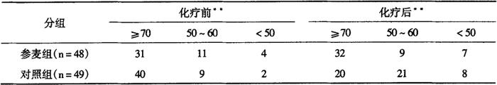 2组治疗前后比:* *P<0.01 对血红蛋白的影响:分析提示,参麦组与化疗组治疗后血红蛋白含量均有不同程度降低(P<0.05,P<0.01),但两组治疗前后比较均无显著差异(P>0.05)。 对其余相关生化指标的影响:研究还分析了参麦液对血沉、血清唾液酸酶、癌胚抗原和血清蛋白/球蛋白比值的影响,除对照组血沉增快外(P<0.05),其余指标未见明显变化(P>0.05)。参麦液对化疗中各种临床症状及全身体力状况的影响:根据WHO抗癌药急性和亚急性毒性分级标准和Kamofsky分级标准,比较了两组治疗临床症状。治后参麦组呕吐出现程度明显低于对照组(P<0.01),心脏节律异常也较少(P<0.05),腹泻、口腔溃疡和心功能状况两组则无差异(P>0.05)。两组全身体力状况比较发现,化疗后参麦组明显优于对照组(P<0.05),见表12-9-64。 表12-9-64 参麦组与对照组化疗前后全身体力状况比较