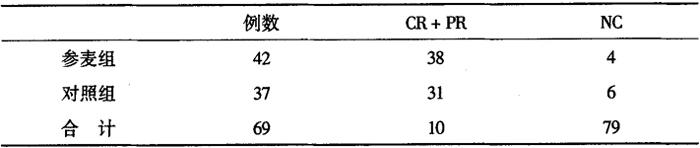 袁氏等[133]从化疗患者中选择79例,均无颅内压增高、肠梗阻或与药物相关的顽固性呕吐者,化疗前24h内无呕吐及未用止吐药者。男48例,女31例,其中肺癌29例,胃癌27例,食管癌10例,大肠癌7例,乳腺癌6例。将患者随机分成两组,参麦组42例,平均年龄51岁,对照组37例,平均年龄49岁,两组平均Kamofsky评分分别为80分、85分。 化疗方案:两组患者使用的化疗方案基本相同,主要有MVP(丝裂霉素+长春新碱酰胺+顺铂),EAP(鬼臼叉苷+阿霉素+顺铂),FAM(5-氟尿嘧啶+阿霉素+丝裂霉素),FAC(5-氟尿嘧啶+阿霉素+环磷酰胺),化疗剂量均为中等。用法:两组患者在化疗过程中每天均使用恩丹西酮8mg及地塞米松5mg静脉推注,在化疗前15min使用以预防化疗所引起的呕吐。参麦组则在化疗过程中加用参麦注射液40~60ml于10%GS500ml的液体中静脉滴注,每天1次,共5~7d。 消化道反应分度及疗效观察:根据WHO标准将恶心呕吐分为0~4级,0级为无;1级恶心;2级偶吐,可控制;3级频繁呕吐需治疗;4级频繁呕吐难以控制。止吐作用评价标准:完全有效(CR)为0级,部分有效(PR)为化疗后仅有1级消化道反应,无效(NC)为化疗后有2级以上的消化道反应。食欲不振的评价标准:食欲评价采用视觉类比量表,即告知两组病人,以化疗前一天的食欲为100%,此后将食欲的增减情况逐日记在视觉类比量表的相应线段上,到参麦注射液结束后一天为止,最后进行统计学分析。 止吐作用的观察:参麦组CR28例,PR10例,CR+PR占90.5%;而对照组CR19例,PR12例,两者相加占83.8%(见表12-9-65),从表中可以看出,参麦注射液对恩丹西酮和地塞米松的止吐作用有一定的增强,但两者之间无显著性差异(P>0.05)。 表12-9-65 参麦注射液预防恶心呕吐和疗效观察