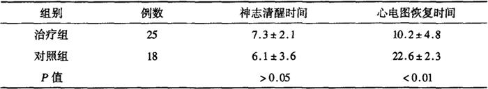 x2=0.31,P>0.05 食欲不振的观察:参麦组中有食欲不振5例,而对照组中出现食欲不振12例,说明参麦组的食欲不振发生率明显下降,两者相比有统计学意义(P<0.05)。副反应:参麦注射液在静脉滴注过程出现皮肤潮红与皮肤瘙痒各2例,停药后消失。 刘氏[134]等对肺癌患者203例进行回顾性分析。结果:化疗后OKT1值参麦组略上升,对照组下降(P<0.05);OKT4/OKT8比值治疗后参麦组明显高于对照组(P<0.05)。参麦组sIL-2受体水平下降,(P<0.05),LAK细胞、NK细胞略上升,(P<0.05),对照组sIL-2受体水平下降不明显(P<0.05),LAK细胞、NK细胞均下降(P<0.05);化疗后参麦组外周血白细胞和血小板降低程度明显小于对照组(P<0.05),全身体力状况也优于对照组。 赵氏[135]等恶性肿瘤病人肿瘤分期均为Ⅲ~Ⅳ期,用化疗方案治疗,治疗组72例常规化疗配合用参麦注射液,对照组54例常规化疗。结果:治疗组有效率83.3%,对照组有效率62.9%,两组差异显著(P<0.05)。用参麦注射液配合化疗治疗中晚期消化道肿瘤病人能增加化疗物疗物,减轻副作用[135]。 参麦注射液对恶性肿瘤化疗增效减毒的报道尚有多篇[136~139]。也可辅助化疗药物治疗晚期非小细胞肺癌[140]、鼻咽癌[141]、白血病[139、142]、多发性骨髓瘤[143]等,具有提高机体免疫作用[144,145],减轻化疗药物的毒副作用。 6.治疗酒精、药物中毒 邓氏等[146]对就诊的急性酒精中毒患者进行观察,发现部分患者伴有心电图异常,经用参麦注射液治疗获得满意疗效。 病例选择:43例急性酒精中毒患者既往均无器质性心脏病史,心电图正常,分为治疗组和对照组。诊断标准:有过量饮酒史,呼吸有酒精气味;出现中枢神经系统兴奋或抑制状态;可排除药物中毒和其他原因引起的昏睡和昏迷。治疗组25例,其中男20例,女5例;年龄18~36岁,饮酒量100~800g,发病时间15~50min,主要症状:烦躁不安5例,昏睡18例,昏迷2例。胸闷8例,心悸12例。心电图类型:心律失常17例,其中窦性心动过速7例,阵发性房颤4例,频发房性早搏2例,室性早搏3例,阵发性室上性心动过速1例。ST-T改变8例,其中ST段压低5例,T波倒置或低平3例。对照组18例,其中男15例,女3例;年龄20~39岁,饮酒量150~1000g,发病时间10~45min,主要症状:烦躁不安3例,昏睡10例,昏迷6例。胸闷6例,心悸8例。心电图类型:心律失常13例,其中窦性心动过速6例,阵发性房颤2例,频发房性早搏3例,室性早搏2例,ST-T改变5例,其中ST段压低2例,T波倒置或低平3例。两组患者的年龄、性别、饮酒量、发病时间、主要症状及心电图类型,经统计学处理均无显著性差异,具有可比性(P>0.05)。 治疗组予患者催吐或洗胃,5%~10%G.S1000~2000ml静滴,参麦注射液(每瓶100ml,内含红参10g,麦冬10g)100~200ml静滴,用药时间2~12h。对照组予患者催吐或洗胃,5%~10%G.S1000~2000ml加入维生素C,维生素B6及普通胰岛素静滴,50%G.S20~40ml加入纳络酮P0.4~1.2mg静滴,用药时间2.5~16h。 表12-9-66 2组治疗结果比较(h,
