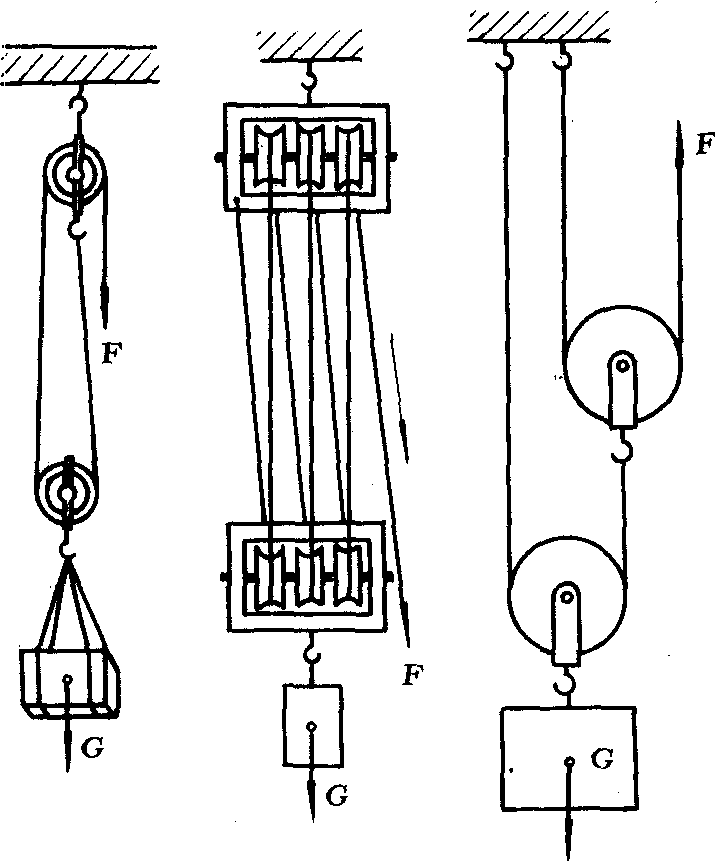 | 释义 | 滑轮huá lún一种简单力学机械,多用来提起重物。通称滑车。1871年傅兰雅译《化学鉴原》卷二:“罩顶有铁链,环过架上之滑轮,而下系权以称之。”1882年徐建寅《欧游杂录》:“辘轳进退运转时,扁带或卷或舒,系层叠而非并排。紧与上滑轮相对,而不致参差。”1931年《英汉对照百科名汇》:“Pulley,滑轮。” 拟状物 拟状物圆形物:球(雪~;气~;棉~;绣~;煤~;铁~;铅~;篮~) 毬 团(花~;泥~;石~;纸~;云~) 蛋(铁~;泥~;粪~) 珠(~子;数~;滚~;眼~;水~;钢~;念~;记~;佛~;露~)弹(~子;铁~) 丸(~子;肉~;泥~;弹~;蜡~;药~) ☚ 某种形态的物品 其他拟状物 ☛ 滑轮 滑轮hualun由周边有沟槽的圆盘和跨过圆盘的柔索(绳、钢索、链条等)使之转动的装置。转动轴的位置固定的滑轮称为定滑轮,转动轴与重物一起移动的滑轮称为动滑轮。滑轮是变形的杠杆,其中定滑轮是一个等臂杠杆,动力臂和阻力臂都等于滑轮的半径,因此动力等于阻力,使用定滑轮不能省力,但能改变动力的方向。动滑轮是一个不等臂杠杆,动力臂等于滑轮的直径,阻力臂是滑轮的半径,因此动力是阻力的二分之一,使用动滑轮可以省力。由定滑轮和动滑轮组合在一起的装置叫做滑轮组,使用滑轮组既能省力又便于操作。可以用杠杆原理或功的原理分析滑轮组的理想机械利益,但在实际应用中,只要看有几股绳子吊着动滑轮,提起物体所用的力就是物体重量的几分之一。图1左图中F=1/2G,中图F=1/6G,右图可算得F=1/4G。