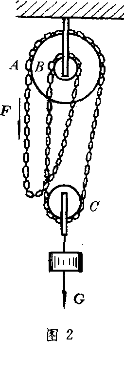 图1 考虑到动滑轮的重量和存在摩擦,实际所用的力都要大一些。为了得到很大的机械利益,常采用差动滑轮,又称神仙葫芦,如图2,这种滑轮组的定滑轮是半径为R A和R B的塔轮,它们联成一个整体且共绕一个定轴用同样的快慢转动。当动力F拉绳使轮转动一周时,大轮卷起的绳长等于2πRA,小轮放下的绳长等于2πRB,重物G和动滑轮上升的位移等于2π(RA-RB)/2,在不计摩擦阻力时,根据功的原理F·2πRA=G·2π(RA-RB)/2,机械利益G/F=2RA/RA-RB,如果使RA和RB相差很小,就可以获得很大的机械利益。差动滑轮和其他滑轮组在起重机、卷扬机和升降机中得到广泛的应用。