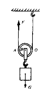 定滑轮 转轴位置固定不动的滑轮,叫做定滑轮。定滑轮实质上是一个等臂杠杆,支点O在滑轮中心,半径OA、OB分别为动力臂和阻力臂,根据杠杆原理,动力F与重力G的大小相等,即F=G(将重物换为砝码,在过滑轮绳的下端系上一弹簧秤,由弹簧秤的读数也能验证此结论)。由此可见,使用定滑轮不能省力,但可以改变作用力的方向,有利于改善劳动条件。转轴位置随起吊重物一起移动的叫动滑轮。动滑轮可被看作是不等臂的杠杆,绳索与滑轮边沿的接触点O为支点,OA为动力臂,OB为阻力臂,根据杠杆原理,有F·OA=G·OB,或F=1/2G,即动力F等于重力G的一半(同样可用弹簧秤验证此结论)。由此可见,使用动滑轮可以省一半的力,但是它不能改变作用力的方向。由图还可以看出,重力G平均分担在吊着动滑轮的两股绳子上,如果忽略动滑轮的重量,则每股绳子只承担物体重量的1/2。