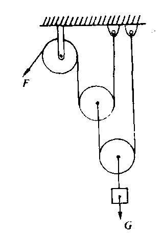 动滑轮 动滑轮与定滑轮在一起可以组合成各种形式的滑轮组。由于使用动滑轮可以省力,使用定滑轮可以改变力的方向,因此把它们配合使用,就能取长补短,既能省力,又能改变作用力的方向。例如在起重机的起重臂到吊钩间通常都应用了滑轮组。对于滑轮组来说,如果绳索与动滑轮的重量及摩擦力可以忽略不计时,连接动滑轮的绳索有n股,则所需用的动力F就是被起吊物体重量的1/n,即F=1/nG。例如图中的F=1/4G。