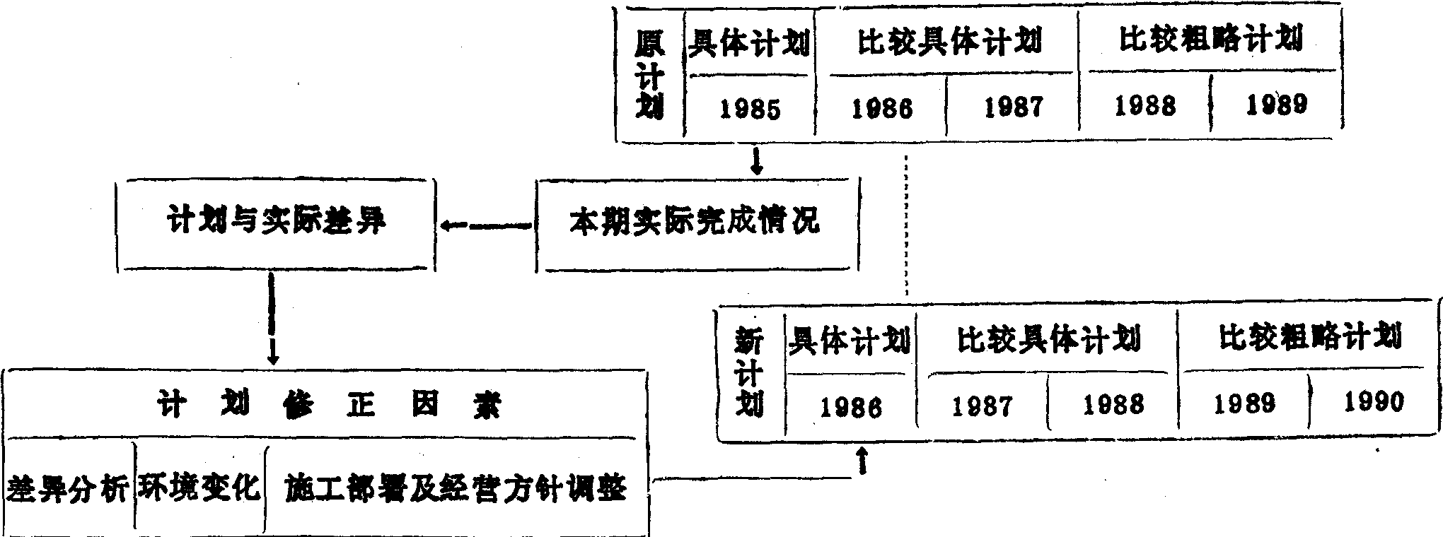| 释义 | 滚动计划亦称“滑动式计划”。国外称“连续计划战略”或“不断接近最优化计划战略”。指采用每实践一年修订一次逐年推进的滚动方式而编制的一种动态性计划。适宜编制企业经营性的中长期计划。由于经济发展中存在许多不稳定的和难以预测的因素,中长期计划不可能一次订得十分周密。因此可以采取近细远粗的方法,近期计划订得细一些,具体一些;远期计划则可订得粗一些、概略一些。同时每年根据变化的情况修订一次,并将计划期向前滚动一年,每年如此,使长期计划逐步完善。这种滚动计划可用下列简图表示:
