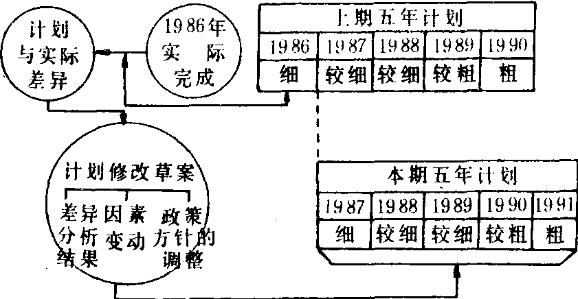 滚动计划示意图 这种滚动计划方法也可用于编制短期计划和作业计划。滚动计划的优点是: (1)计划前后期衔接紧密,能更好地反映经营活动的连续性,既可以指导企业当前或近期的经营活动,又可为未来发展作好准备工作,使连续的生产经营活动过程有一个连续性的计划作指导。(2)能结合客观条件的变化适时调整计划,提高其准确性和指导性,加强事前控制,纠正计划工作的被动局面。(3)长期计划与短期计划,以及年度计划与季度计划可以前后衔接,即使不平衡也可及时修订,使各种计划不致于相互脱节。 滚动计划 滚动计划Rolling Plan根据运筹学的规划论的原理,编制灵活、有弹性的中、长期计划,使企业不断适应市场需求,保证生产稳定增长和均衡发展的计划管理技术之一。它是于20世纪70年代后发展起来的一种新的现代化管理方法。 ☚ 远期预测 中期计划 ☛ 滚动计划 滚动计划亦称滑动式计划或连续计划。指逐年逐期往后推移而制定的、在其执行年限上带有 “滚动性” 的一种计划。滚动计划在时间上主要指两年以上的中长期计划。它的编制是指一个两年以上的计划按年度分别列出年计划,每执行一个年度计划,便根据其实际执行情况,修订余下的各年度计划,并将计划期向前推进一年,续补上一个年度计划。这样,每年都有一个新的中长期计划,它的特点是把计划工作看作为一种不间断的运动,计划随实际情况变化而变化,从而保证计划的稳定性、灵活性和连续性。 ☚ 弹性计划 国家计划 ☛ 滚动计划 滚动计划亦称“滑动式计划”。指在起止年限上带有“滚动式”的一种中、长期计划。滚动计划的特点是把计划工作看作一个不间断的运动,计划随实际情况的变化而变化。它的编制是在制定或调整中、长期计划时,将计划期顺序向前延续一段时间。实行滚动计划,可以使长、中、短期计划更好地衔接起来,有利于保持计划的连续性和稳定性,使计划更加切合实际,提高计划的科学性,并始终有一个长远计划作指导,保证国民经济长期均衡发展。目前我国对如何实行滚动计划有两种看法: 一种主张对中期计划实行一年一滚动。近细远粗。每执行一个年度计划,则根据其实际执行情况和各种条件的变化,修订余下年度的计划,同时续补上新的一年计划。这样,在年度计划执行中,每年保持一个在年度之间前后衔接的五年计划。例如,1985年制定1986—1990年的五年分年度计划,若采用滚动计划法,到1986年底,便根据1986年计划的完成情况和各种因素的变化,对原定五年计划进行必要的调整,在此基础上编制1987—1991年的五年计划。其后依此类推 (见下图)。另一种看法认为,“一年一滚动”使计划部门总陷入编制计划的事务中,不能充分考虑和研究计划中的新情况、新问题和国民经济发展中的重大方针政策等。因而,主张在长期计划中实行“五年一滚动”。即把长期计划的任务按五年分列。第一个五年定得细一些,依次渐粗。当第一个五年计划执行到三、四年时,就根据执行情况及对未来各种条件的分析,将下一个五年计划具体化和作必要的修正,同时在原定长期计划后面再续一个五年计划的设想,如此类推。这样,在中期计划的执行中,每五年可以保持一个在中期计划之间前后衔接的长期计划。