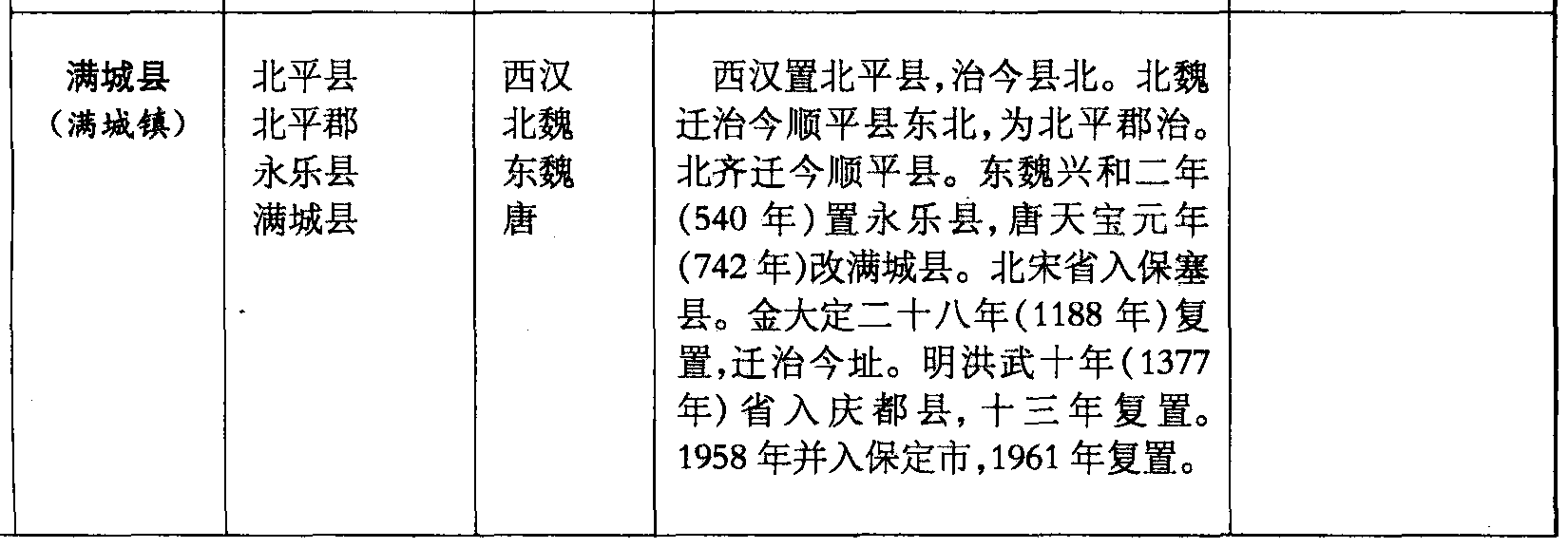 满城县(满城镇)北平县北平郡永乐县满城县西汉北魏东魏唐西汉置北平县,治今县北。北魏迁治今顺平县东北,为北平郡治。北齐迁今顺平县。东魏兴和二年(540年)置永乐县,唐天宝元年(742年)改满城县。北宋省入保塞县。金大定二十八年(1188年)复置,迁治今址。明洪武十年(1377年)省入庆都县,十三年复置。1958年并入保定市,1961年复置。