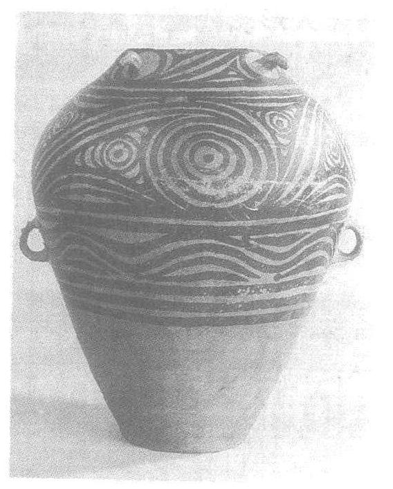 | 释义 | 漩涡纹彩陶罐 漩涡纹彩陶罐新石器时代马家窑文化马家窑类型。高50厘米,口径18.4厘米。甘肃省永靖县出土。北京中国历史博物馆藏。此罐为彩陶中的一件名器,并成为1990年邮电部发行的一套4枚彩陶邮票中的入选品。其状为:平口、无颈、阔肩、腹部逐渐下收。口下有4个钩状突起物,腹饰两个对称的半环耳。器表打磨光滑精致,彩绘三层赭黑纹饰。上层以钩状物为中心勾画圆圈,并以弧线相连。中层为主体纹饰,饰漩涡纹,湍急的水流连接一个个漩涡。下层饰有水波纹。纹饰线条流畅、匀整,瑰丽多姿,具有很高的艺术水平,是罕见的彩陶珍品。马家窑文化见“束腰彩陶罐”条目。