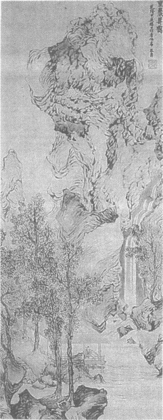 清。潘恭寿绘。纸本设色。纵81.5厘米,横31.5厘米。山东省泰安市博物馆藏。潘恭寿(公元1741—1794年),字慎夫,号莲巢,丹徒(今江苏镇江)人,工诗善画。少学山水,苦无师承,王文治遂授以书家用笔之道,其艺日进。王宸又以“宿雨初收,晓烟未泮”八字画题予以启发。山水学文徽明,花卉取法恽寿平。佛像及仕女,韵秀有古意,竹石亦佳,尤善临摹古迹,与张崟、顾鹤庆等并称为“丹徒派”,有《龟仙精舍集》。此图写重岩兀立,雄奇险峻,山石间飞瀑直泻,下汇成潭,訇然有声。近处山石之上古木参天,暮色低垂。涧边树下茅榭之内,老翁独坐,静听泉声。山石多用披麻皴、乱柴皴,以赭色淡染,笔力凝重;树木勾染结合,墨色层次丰富;以淡墨勾出水纹,线条流畅。构图满而不繁,充满幽淡清雅之韵致。款识:“重岩暮蔼,乾隆甲辰(公元1784年),噶日仿唐伯虎。”