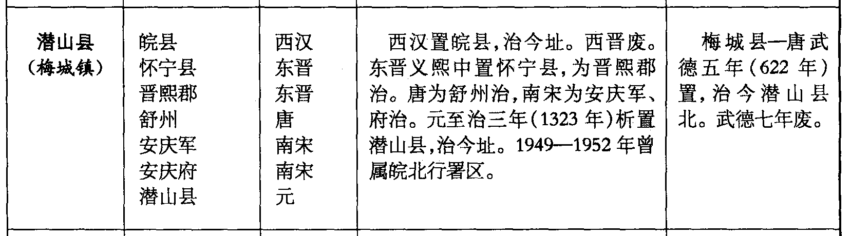 潜山县(梅城镇)皖县怀宁县晋熙郡舒州安庆军安庆府潜山县西汉东晋东晋唐南宋南宋元西汉置皖县,治今址。西晋废。东晋义熙中置怀宁县,为晋熙郡治。唐为舒州治,南宋为安庆军、府治。元至治三年(1323年)析置潜山县,治今址。1949—1952年曾属皖北行署区。梅城县—唐武德五年(622年)置,治今潜山县北。武德七年废。