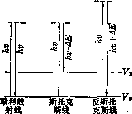 图1 分子能级跃迁示意图 光谱上。振动Ⅲ和Ⅳ等同,Ⅳ中(+)表示向纸外运动,(-)表示向纸内运动。它们只有键角弯曲,没有键长改变,α变化很小,ν3不能在拉曼光谱中观察。另一方面、红外活性必须伴随有偶极矩变化,振动Ⅱ、Ⅲ、Ⅳ都有偶极矩变化,在红外光谱中看得到。振动Ⅰ的两个键同时伸长,同时缩短,分子的偶极矩始终等于零,它是红外惰性的。许多振动既能出现于红外光谱,也能出现于拉曼光谱。一般说来,红外谱带越强,拉曼谱带就越弱,反之也然。