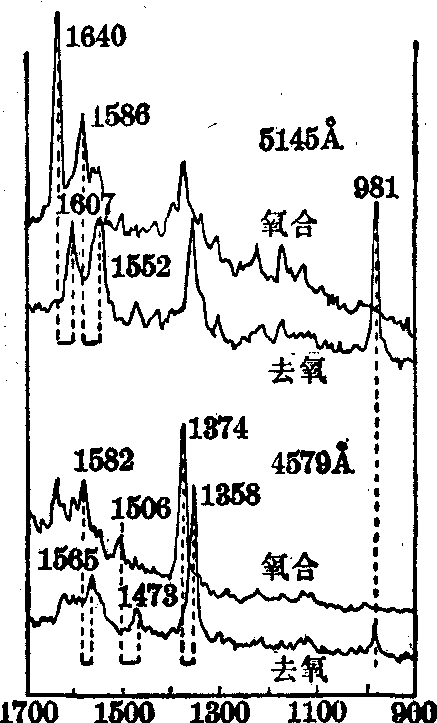 图3 激光拉曼光谱仪示意图 实际应用 激光拉曼光谱的谱带丰富,各种化学基团有其特征的频率位移,谱带的强度和分子的几何形状、振动方式有密切的关系,故可用这些谱带来鉴别物质,测定分子结构,研究分子内部和分子间力的相互作用以及由于这些力的作用而起的结构变化等。激光拉曼光谱广泛用于无机、有机、高分子、环境保护、食品、纺织品等多种学科。特别在生物科学方面,可以用来研究蛋白质与核酸的一级、二级结构; 酶与底物的相互作用; 小分子和大分子的相互作用; 膜的结构和功能; 肿瘤细胞和正常细胞的差异; 病毒的结构特征等。例如,当一个血红蛋白分子与氧结合,或与氧分开时,其激光拉曼光谱就会显示明显差别,可见这项技术对研究血红蛋白氧合过程的分子生物学机理,提供了有利手段(图4)。一个纯的核酸或者蛋白质有30~40条拉曼线在300~1700cm-1范围内,由此可获得核酸的有序结构,碱基堆积,蛋白质的主键构象(α螺旋、β折叠、自由卷曲),侧链残基的构型及所处环境等多种信息。拉曼光谱有许多优点,如某些红外不敏感的基团S—S、C—C、N—N键有强的拉曼谱线; 样品处理方便,可用玻璃作样品池,用水作溶剂,它们对图谱的干扰很小,有利于在水溶液中研究生物大分子的结构功能关系,这样更接近生物分子的天然存在状态; 激光的使用,使样品的用量减至很少 (可少至几微克),可以用来研究来源困难的生物样品; 拉曼光谱是一项散射技术,与一般透射技术不同,它不需要样品透明,天然材料也可以不被破坏,固体、液体都可以测量。目前已发展了以拉曼散射为基础的 “分子微探针”技术。活的生物组织的研究亦有报道。例如,使用一毫瓦的激光、照射在一个完整的牛眼睛上,研究蛋白质残基的分布(蛋白质残基的分布被认为与眼睛的老化,白内障的形成有关),在强化视象检测器的帮助下,可以获得很好的图谱,这样低的功率已不致伤害视网膜。可以预料,激光拉曼光谱应用在医学上,有宽广的前途。