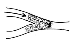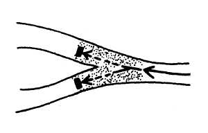 本法则由Cranefield于1971年提出。激动的相加首先需要传导纤维的一种特殊排列,即两支纤维汇集到一支纤维的解剖结构,这样在两支纤维内传导的激动如能同时抵达,从而在纤维汇合处相遇,就可相加而形成一个较强的激动,通过汇合纤维,如该汇合纤维的某一节段组织是受抑制的,则激动能否通过此抑制区,就取决于激动的强度。如激动能相加成一个较强的激动,就能通过该区(图A);如一个激动提前抵达,而不能相加,则这个提前抵达的激动就不能通过该抑制区(图B);如激动是从逆向通过此区则是激动的分散,结果造成阻滞(图C)。