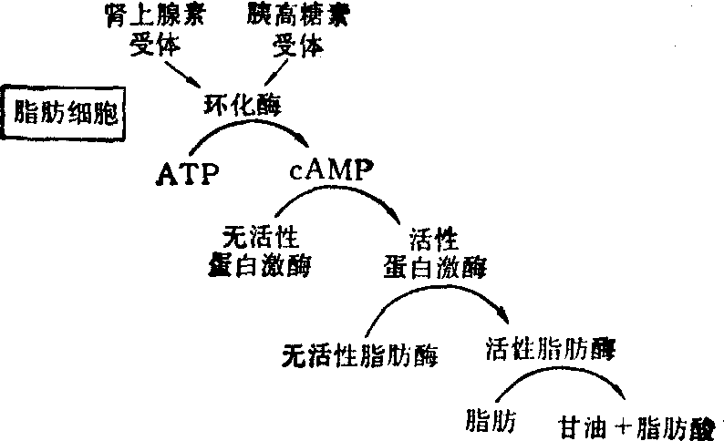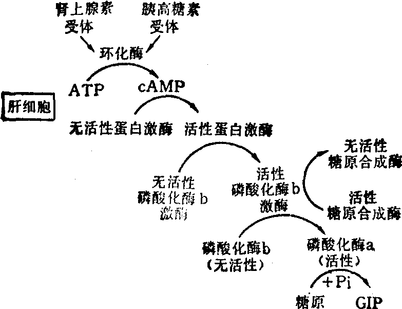 图1 激素通过细胞膜上受体的作用机理 1958年Sutherland首次从加肾上腺素或胰高糖素的肝匀浆中分离出cAMP,此物质系细胞膜中的腺苷酸环化酶作用于胞浆中的ATP所生成,胞浆中的磷酸二酯酶则催化cAMP的磷酸二酯键的水解,生成5′-腺苷酸而失活。腺苷酸环化酶存在于哺乳动物的所有组织细胞中 (成熟红细胞例外) 是细胞膜中的一种靠近内侧的嵌入蛋白质,它紧密地与靠近膜外侧的另一种嵌入蛋白质即激素的受体相联系。 以肾上腺素和胰高糖素对肝细胞和脂肪细胞的作用为例,其作用机理如图2、图3。 蛋白激酶是催化蛋白质(包括酶)发生磷酸化作用的一类酶,被催化的酶有的经磷酸化作用后从无活性变为有活性,如磷酸化酶b激酶和脂肪酶,但也有的酶经磷酸化作用后从有活性变为无活性,如糖原合成酶。