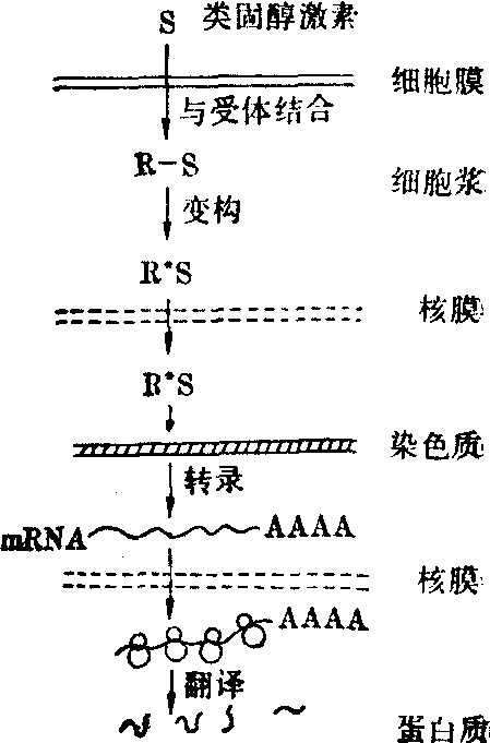 图3 肾上腺素和胰高糖素对脂肪细胞作用机理 从上面可以看到这类激素在靶细胞内所引起的作用都会引起cAMP的增加,因此cAMP是“第二信使”(激素是第一信使)。 在许多情况下,发现这类激素的作用还必需有Ca2+的存在,因此认为Ca2+是另一个第二信使。另一种环核苷酸,即环磷酸鸟苷 (cGMP)也被认为是一种第二信使,并且它的浓度增减往往与cAMP相反,两者有拮抗作用,其关系与祖国医学中的“阴阳学说”有某些相似。 通过细胞内受体的作用机理 类固醇激素随血液抵达靶细胞后,并不停留在细胞表面,而是通过细胞膜扩散进入到细胞内。细胞浆中存在着可溶性的各种类固醇激素的受体,可以特异地和它相应的类固醇激素相结合,形成激素受体复合物。此复合物经过一定的构象的变化后,可以进入细胞核与染色质某部位基因区结合,从而促进某些mRNA的转录合成。所合成的mRNA离开胞核到胞浆中与核糖体结合,引起特异蛋白质的合成,于是产生了激素的特定生理效应。(图4) 甲状腺激素随血流抵达靶细胞后,也是通过细胞模扩散到细胞内去的,但目前尚未能在细胞浆中发现特异的甲状腺激素受体。在肝、肾等的细胞核及线粒体上发现有甲状腺激素的受体,其详细作用机理尚不清楚。